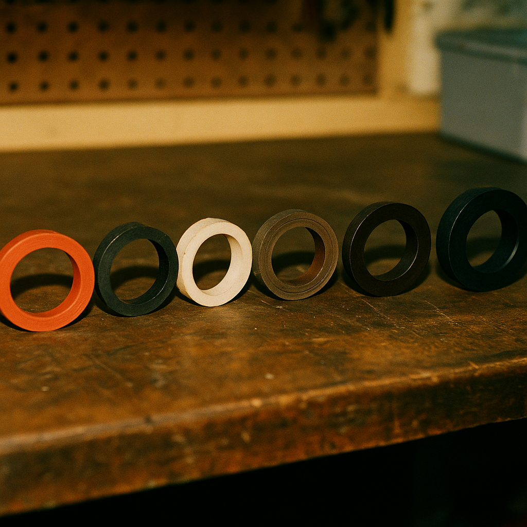 variety_of_gaskets-jpg תמונה קודמת תמונה הבאה Photo of different types of rubber gaskets lined up on a workshop table, emphasizing texture and material.